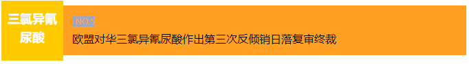 2023年12月14日,欧盟委员会发布公告称,对原产于中国的三氯异氰尿酸(Trichloroisocyanuric Acid)作出第三次反倾销日落复审终裁,裁定若取消反倾销措施,涉案产品的倾销及其对欧盟产业的损害会继续或再度发生,因此决定继续维持对涉案产品的反倾销措施,裁定河北冀衡化学股份有限公司(Hebei Jiheng Chemical Co. Limited)的倾销幅度为8.1%、河南濮阳可利威化工有限公司(Puyang Cleanway Chemicals Limited)的倾销幅度为7.3%、山东菏泽华意化工有限公司(Heze Huayi Chemical Co. Limited)的倾销幅度为3.2%、山东诸城泰盛化工有限公司(Zhucheng Taisheng Chemical Co. Limited)的倾销幅度为40.5%、聊城市中联实业有限公司(Liaocheng City Zhonglian Industry Co. Ltd.)的倾销幅度为32.8%、中国其他出口商/生产商的倾销幅度为42.6%。涉案产品欧盟CN(Combined Nomenclature)编码为ex 2933 69 80和ex 3808 94 20(欧盟TARIC编码为2933 69 80 70和3808 94 20 20)。本案的倾销调查期为2021年10月1日~2022年9月30日,损害调查期为2019年1月1日~调查期结束。