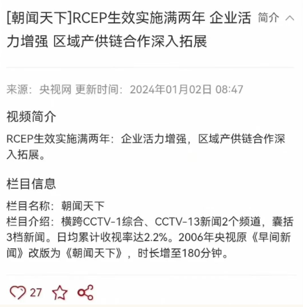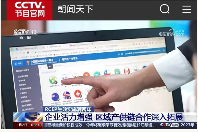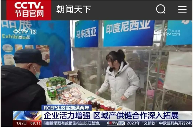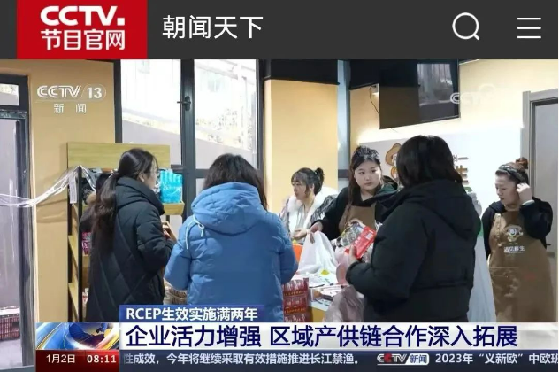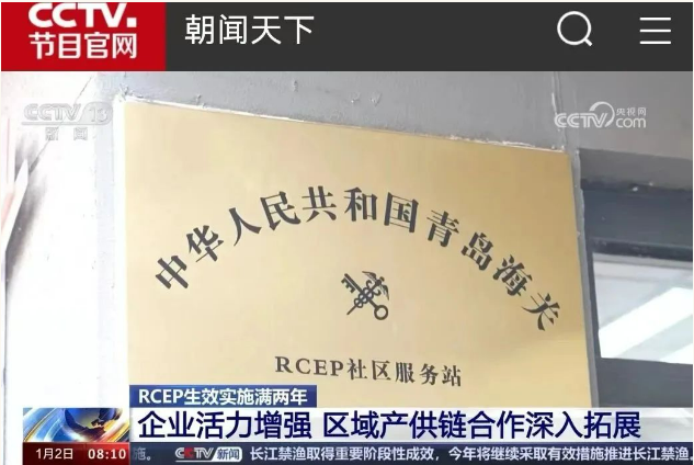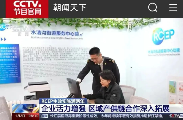 1月2日,央视《朝闻天下》栏目以“RCEP生效实施满两年:企业活力增强,区域产供链合作深入拓展。”为题,图文画面报道RCEP水清沟街道服务中心和RCEP进出口商品展:“在山东青岛,新设的7个RCEP社区服务站,不仅把海关的服务送到了企业门口,也把RCEP成员国的好产品,送到了老百姓的家门口。”