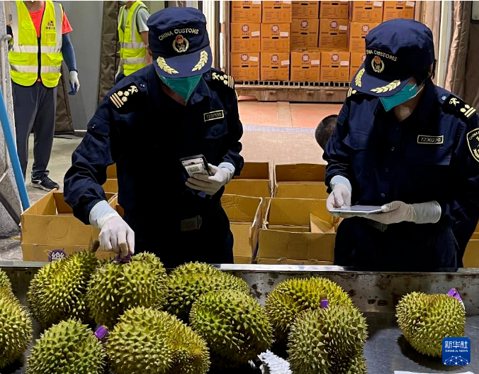 在广西友谊关口岸,工作人员在检查进口榴莲(2023年4月21日摄)。新华社记者 聂新宇 摄