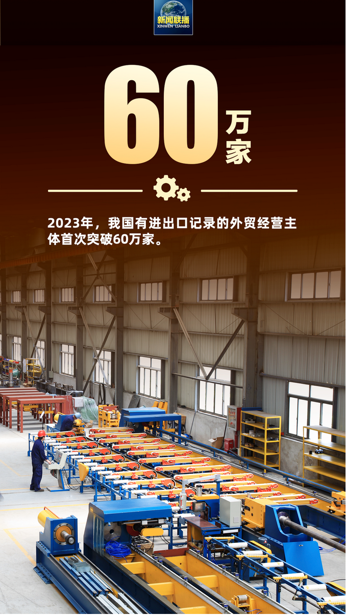 2023年,我国有进出口记录的外贸经营主体首次突破60万家。其中,民营企业55.6万家,合计进出口22.36万亿元,增长6.3%,占进出口总值的53.5%,提升3.1个百分点。
