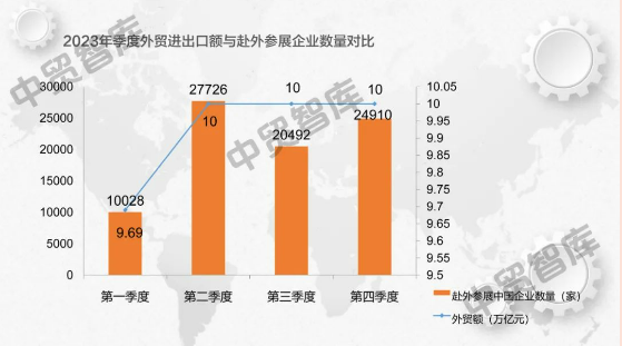 尽管2023年外贸总额数据有所波动,但从季度整体情况来看,我国外贸总额总体平稳,一季度为9.69万亿元,到二、三、四季度都在10万亿元以上。与此同时,我们系统检测到的2023年一季度到四季度的赴外参展中国企业数量分别是10028家、27726家、20492家、24910家,考虑到一、四季度是外展旺季,而三季度相对是淡季的因素,我国企业赴外参展发展平稳。