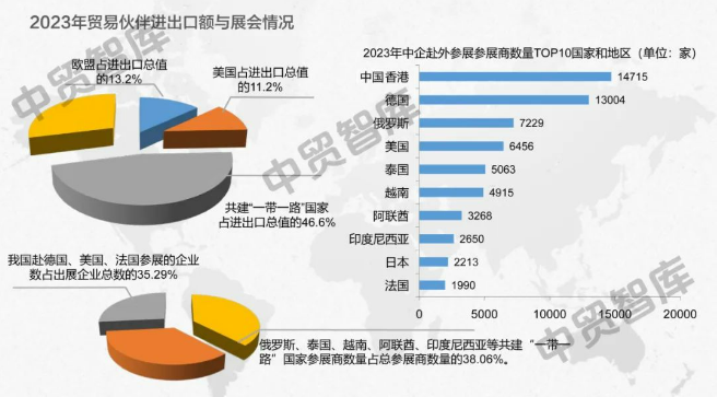2023年中企赴外参展TOP10国家和地区分别是中国香港(14715家)、德国(13004家)、俄罗斯(7229家)、美国(6456家)、泰国(5063家)、越南(4915)、阿联酋(3268家)、印度尼西亚(2650家)、日本(2213家)、法国(1990家)。我国对欧盟、美国全年分别进出口5.51万亿元、4.67万亿元,分别占我国出口总额的13.2%和11.2%,我国赴德国、美国、法国参展的企业数占出展企业总数的35.29%。2023年我国对共建“一带一路”国家进出口19.47万亿元,占进出口总额的46.6%,而在赴外参展TOP10国家和地区中,俄罗斯、泰国、越南、阿联酋、印度尼西亚均为共建“一带一路”国家,其参展商数量占总参展商数量的38.06%。