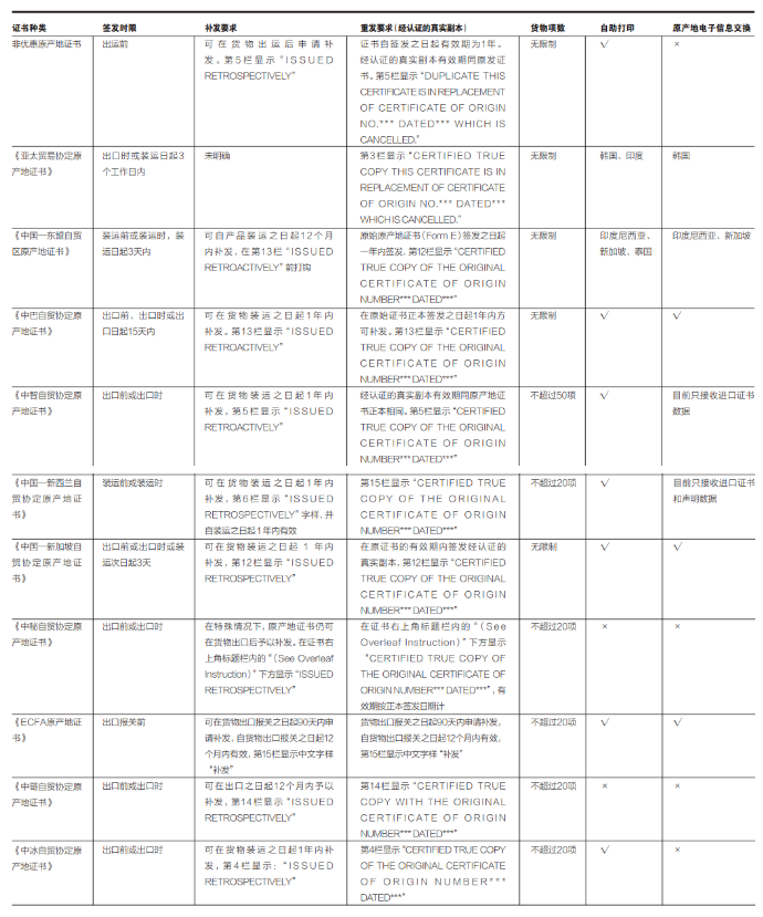 大部分证书可在货物装运之日起1年内申请补发。但需要注意的是,《亚太贸易协定》项下原产地证书(以下简称《亚太贸易协定原产地证书》)未明确补发事项,应在货物出口时或装运日起3个工作日内申请,《海峡两岸经济合作框架协议》(ECFA)项下原产地证书(以下简称《ECFA原产地证书》)须在货物出口报关之日起90日内申请补发。