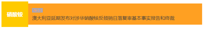 2024年2月14日,澳大利亚反倾销委员会发布第2024/008号公告称,延期发布对进口自中国、瑞典和泰国的硝酸铵(Ammonium Nitrate)反倾销日落复审调查的基本事实报告和终裁建议。预计澳大利亚委员会将不晚于2024年2月20日发布基本事实报告,不晚于2024年4月19日向澳大利亚工业科技部部长提交终裁建议。