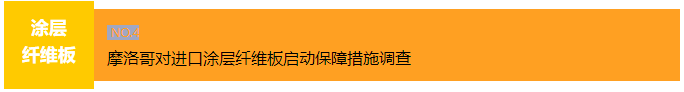 2024年2月19日,摩洛哥工业、贸易、绿色与数字经济部发布第DDC/02/2024号公告,应摩洛哥国内企业CEM A BOIS DE L’ATLAS提交的申请,对进口涂层纤维板(法语:panneaux de fibres de bois revêtus)启动保障措施调查。涉案产品由木纤维制成,表面覆盖有三聚氰胺装饰纸或装饰塑料片或片材。涉及摩洛哥海关编码4411.12.00.90、4411.13.00.90、4411.14.00.90、4411.92.00.90、4411.93.00.90和 4411.94.00.90项下的产品。公告自发布次日起生效。