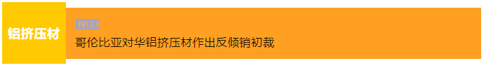 2024年4月18日,哥伦比亚贸工旅游部在其官网发布2024年4月15日第093号公告称,对原产于中国的铝挤压材(西班牙语:perfiles extruidos de aluminio)作出反倾销初裁,初步裁定继续反倾销调查,不征收临时反倾销税。涉案产品的哥伦比亚税号为7604.21.00.00、7604.29.10.00、7604.29.20.00和7608.20.00.00。公告自发布次日起生效。