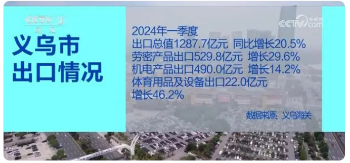 数据显示,2024年一季度,义乌市出口总值达1287.7亿元,同比增长20.5%。其中,劳密产品出口529.8亿元,增长29.6%;机电产品出口490.0亿元,增长14.2%;而体育用品及设备出口达到22.0亿元,增长46.2%。业内人士表示,巴黎奥运会即将召开,以及外商圣诞采购季开始,欧美市场补库存需求增加,使得相关产品出口占比显著提升。